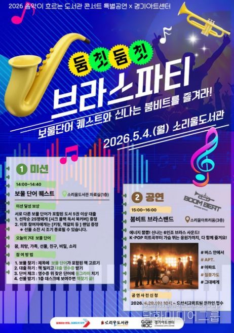 시민행정신문 기자 | 오산시 소리울도서관은 제104회 어린이날을 앞둔 오는 5월 4일 경기아트센터와 협업해 ‘2026 음악이 흐르는 도서관 콘서트’ 특별공연인 ‘둠칫둠칫 브라스 파티’를 개최한다고 밝혔다.