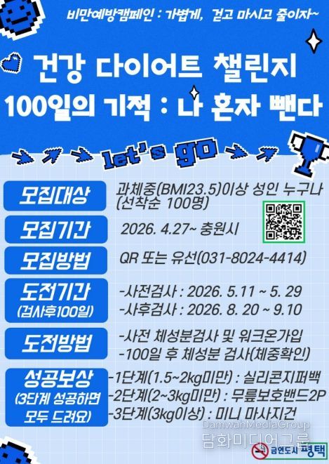 시민행정신문 기자 | 평택시는 시민들이 스스로 비만 관리 능력을 키우고 건강한 생활 습관을 정착시킬 수 있도록 돕는 비만 예방 프로그램 '100일의 기적’참가자를 모집한다고 밝혔다.