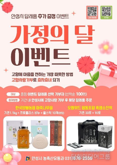 시민행정신문 강갑수 기자 | 안성시는 오이데이와 5월 가정의 달을 맞아 고향사랑기부제 참여 확대와 지역 농산물 소비 촉진을 위해 ‘오이데이 이벤트’와 ‘가정의 달 이벤트’를 추진한다고 밝혔다.