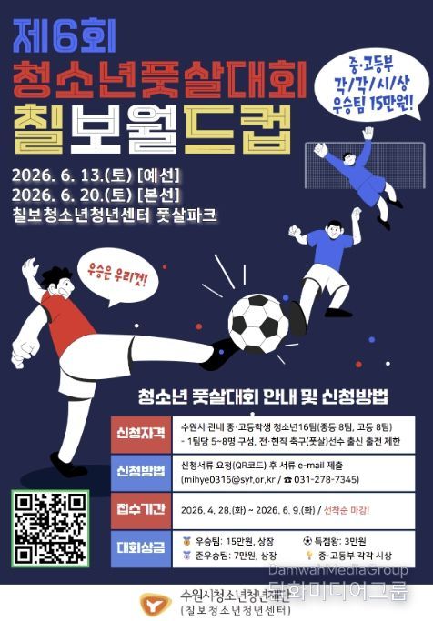 시민행정신문 기자 | 수원시청소년청년재단 칠보청소년청년센터는 오는 6월 13일(예선)과 20일(본선), 양일간 센터 내 풋살파크에서 녪. 청소년 풋살대회 [제6회 칠보월드컵]’을 개최한다고 밝혔다.