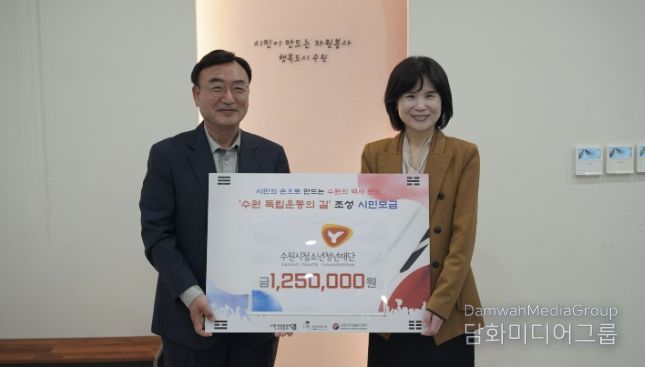 ‘수원 독립운동의 길 시민모금 사업’은 수원의 자랑스러운 독립운동 역사를 기억하고 알리기 위해 시민과 단체들의 자발적인 참여로 이루어지는 자율 모금 캠페인이다. 이번에 전달된 기부금 전액은 재단 임직원들의 자율적인 모금을 통해 마련됐으며, 향후 수원 지역 내 독립운동 유적지를 잇는 탐방로 조성 및 기념 표지석 설치 등에 사용될 예정이다.
