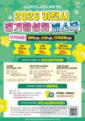 한편, 이천시에서 연말까지 진행하고 있는 ‘2026 이천시 경기활성화 페스타’의 주요 혜택 내용은 ➀지역화폐 충전 시 인센티브 10% 지급(월10만 원 한도) ➁작은가게(연매출 3억 원 이하 가맹점)에서 결제 시 10% 캐시백 지급[월 10만 원 한도 / 5월(가정의 달), 9월(추석달)은 전체 가맹점에서 결제 캐시백 혜택] ➂배달특급에서 지역화폐 결제 시 추가 20% 캐시백 지급 혜택(월 2만 원 한도) 등이 있으며, 배달특급에서 지역화폐로 결제할 경우 최대 40%까지 할인되는 놀라운 혜택을 볼 수 있다.