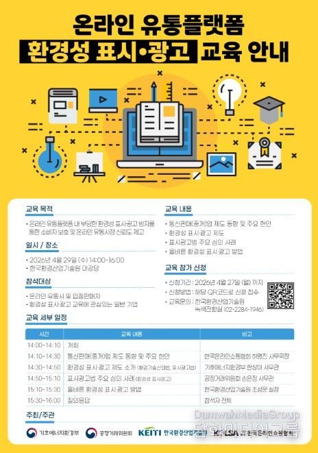 시민행정신문 김학영 기자 | 공정거래위원회와 기후에너지환경부는 4월 29일 한국환경산업기술원 대강당(서울 은평구 소재)에서 온라인 유통사를 대상으로 ‘환경성 표시·광고 교육’을 개최한다고 밝혔다.
