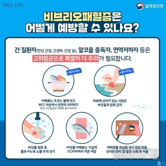특히 만성 간 질환자, 당뇨병, 알코올의존자, 면역결핍 환자, 악성종양 등 비브리오패혈증 고위험군은 감염 시 치명률이 높으므로 더욱 철저한 주의가 필요하다.