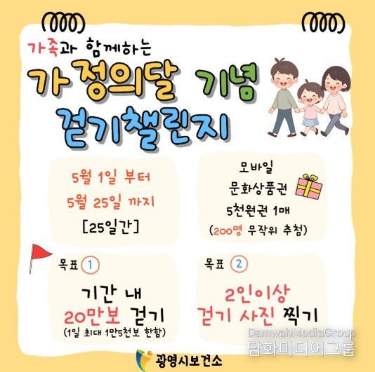 시민행정신문 기자 | 광명시가 오는 5월 가정의 달을 맞아 시민 건강을 증진하고 가족 유대를 강화하고자 ‘2026년 가정의 달 기념 걷기 챌린지’를 운영한다.