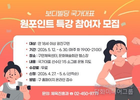운영 기간은 5월 12일부터 6월 30일까지로, 매주 화요일 오후 7시부터 9시까지 총 8회 진행된다. 장소는 광진구민체육센터와 광진문화예술회관 헬스장 2곳이다.