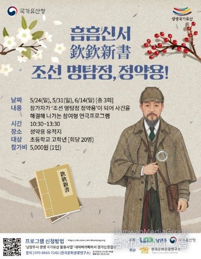 시민행정신문 기자 | 남양주시는 오는 5월 24일과 31일, 6월 14일 정약용 유적지에서 초등학교 고학년을 대상으로 참여형 연극 프로그램 ‘흠흠신서: 조선 명탐정, 정약용!’ 참가자를 모집한다고 밝혔다.