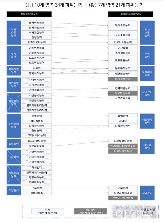 또한 기존의 10개 영역, 34개 하위능력에서 7개 영역, 21개 하위능력으로 재구조화한다. 노동시장 변화에 따라 활용도가 낮아진 항목은 과감히 폐지하고, 인공지능(AI) 활용능력, 디지털책임의식, 산업안전보건의식 등 미래 핵심 영역을 신설하여 제도의 현장성을 대폭 강화했다.