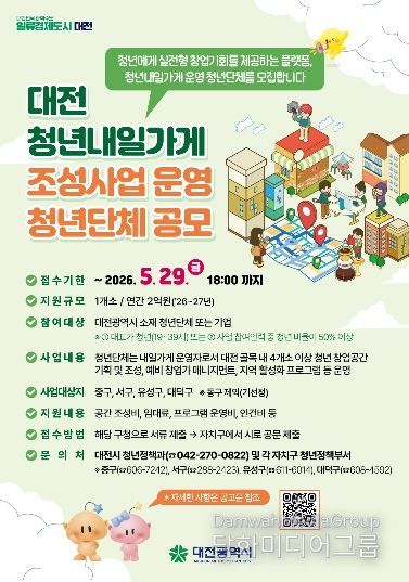 시민행정신문 이세훈 기자 | 대전시는 청년이 지역에서 창업을 직접 경험하고 성장할 수 있는 ‘청년내일가게 조성사업’ 운영단체를 5월 29일까지 공개 모집한다.