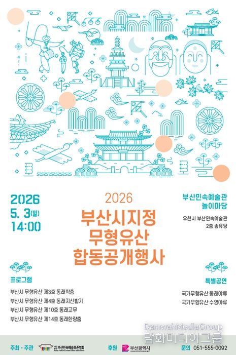 시민행정신문 강갑수 기자 | 부산시는 오는 5월 3일 오후 2시 부산시 무형유산 전수교육관인 '부산민속예술관 놀이마당'에서 무형유산의 보존과 원형 전승을 위한 '2026 부산광역시 지정 무형유산 합동 공개행사'를 개최한다고 밝혔다.