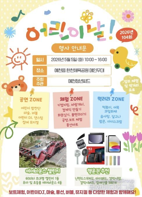 예천군 관계자는 “어린이날은 어린이가 존중받고 사랑받아야 할 소중한 날”이라며 “아이들이 마음껏 뛰놀고, 가족이 함께 웃을 수 있는 안전하고 즐거운 행사가 되도록 준비에 최선을 다하겠다”고 말했다.