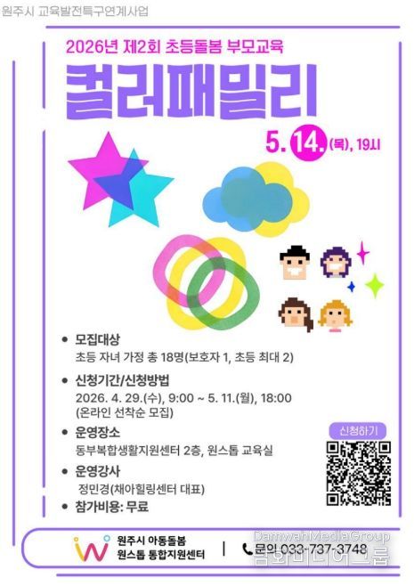 시민행정신문 강갑수 기자 | 원주시 아동돌봄 원스톱통합지원센터는 다음 달 14일 오후 7시, 관내 초등학생 자녀와 보호자를 대상으로 가족 간의 이해와 소통을 돕는 부모교육 프로그램 ‘컬러패밀리’를 운영한다.