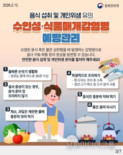 주요 예방수칙은 ▲흐르는 물에 30초 이상 손 씻기 ▲음식물 충분히 익혀 먹기 ▲물 끓여 마시기 ▲채소·과일은 깨끗한 물에 씻어 먹기 ▲설사 증상이 있는 경우 음식 조리하지 않기 등이다.