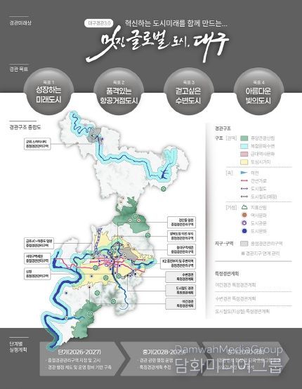 대구시는 산림·하천·도심을 유기적으로 연결하는 경관구조를 새롭게 설정했다. 시 전역을 기능과 특성에 따라 경관권역으로 구분하고, 주요 자연 및 기반시설을 잇는 경관축과 도시의 상징 공간인 경관거점을 체계화해 도시 전체를 하나의 통합된 경관 시스템으로 관리할 수 있도록 했다.