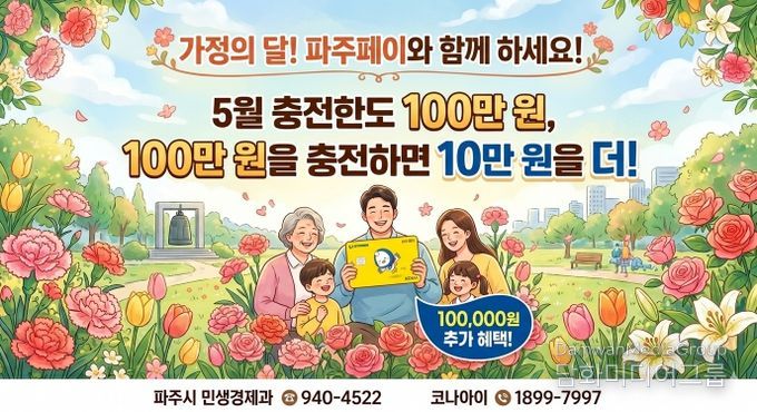 시민행정신문 강갑수 기자 | 파주시는 5월 가정의 달을 맞아 5월 1일부터 5월 31일까지 한 달간 지역화폐 파주페이의 월 충전한도를 기존 70만 원에서 100만 원으로 상향한다.