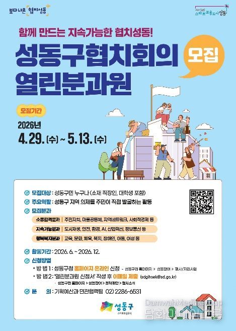 시민행정신문 강갑수 기자 | 서울 성동구는 지역사회 주요 현안 해결과 민관 협치 활성화를 위해 '2026년 성동구 협치회의 열린분과원'을 4월 29일부터 5월 13일까지 15일간 모집한다고 밝혔다.