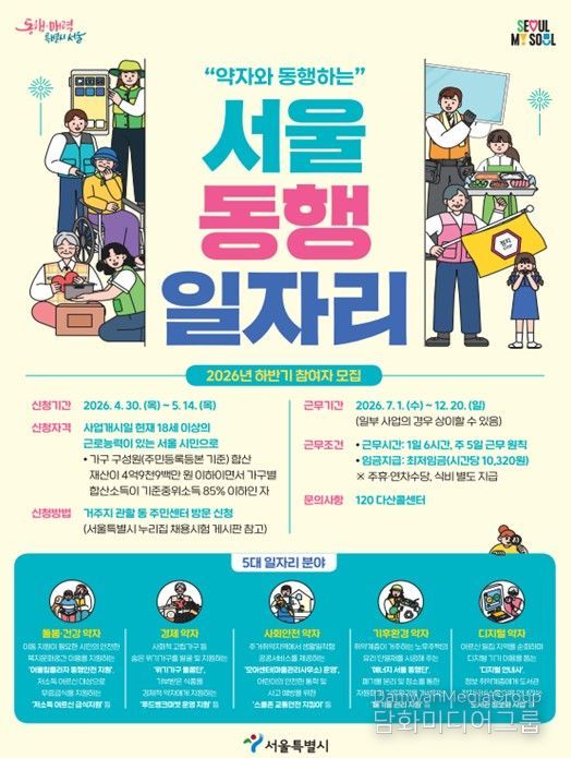 이수연 서울시 경제실장은 “고용 불안이 지속되는 상황을 고려해 하반기에는 모집 규모를 늘려 고용 사각지대에 놓인 취업 취약계층의 자립 지원을 강화하고자 한다”며, “참여자들이 지역사회 곳곳에 공익적 가치를 창출할 수 있는 양질의 일자리를 지속적으로 확대해 나가겠다”고 밝혔다.