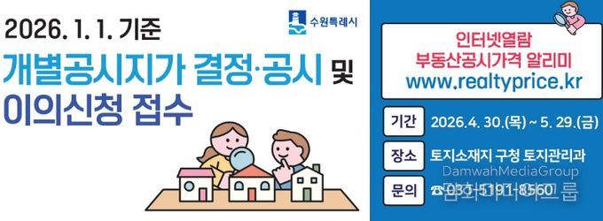 시민행정신문 강갑수 기자 | 수원시 영통구는 2026년 1월 1일 기준 개별공시지가를 4월 30일 결정·공시하고, 5월 29일까지 이의신청 기간을 운영한다.