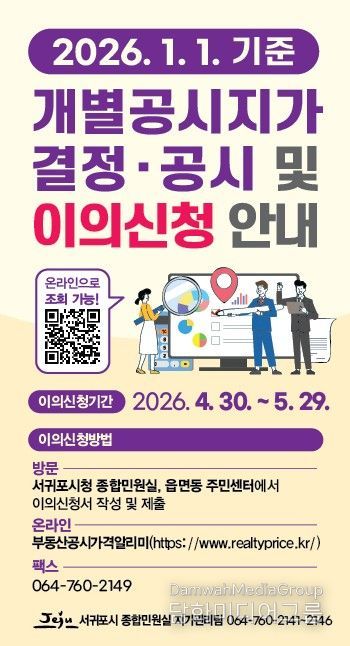 시민행정신문 강갑수 기자 | 서귀포시는 2026년 1월 1일 기준 개별공시지가를 4월 30일 결정·공시한다.