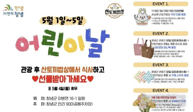 어린이날을 맞아 5월 1일부터 5일까지(4일 휴무) 관내 관광지 입장권과 산토끼밥상 주문 영수증을 제시하면 다양한 선물도 받을 수 있다.