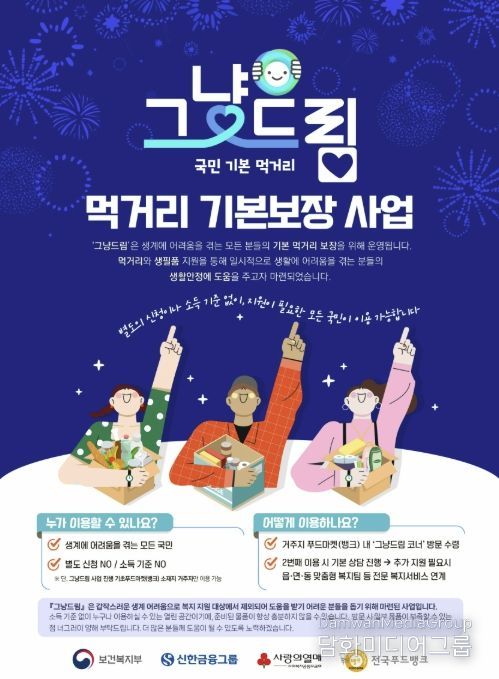 ‘그냥드림(먹거리 기본보장)’은 올해 12월까지 월요일부터 금요일까지 오후 2시부터 5시까지 운영하며, 쌀과 면·빵류, 김, 통조림, 라면 등 식료품과 생활필수품을 1인당 3~5개 품목으로 구성해 제공한다.