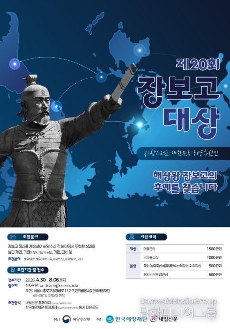 시민행정신문 강갑수 기자 | 해양수산부는 4월 30일부터 8월 6일까지 ‘제20회 장보고대상’ 후보자를 공모한다고 밝혔다.
