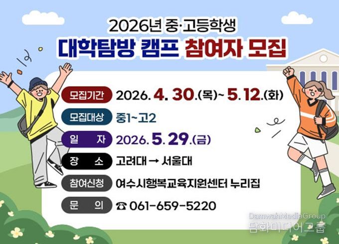 시민행정신문 강갑수 기자 | 여수시는 오는 30일부터 관내 중학교 1학년부터 고등학교 2학년 학생들을 대상으로 ‘2026년 중·고등학생 대학 탐방 캠프’ 참여자를 모집한다.