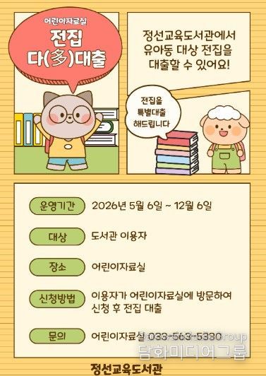 시민행정신문 기자 | 정선교육도서관은 5월 6일부터 12월 6일까지 어린이자료실에서 어린이자료실 이용 활성화와 지역 내 독서 문화 확산을 위해 ‘전집다(多)대출’을 운영한다.