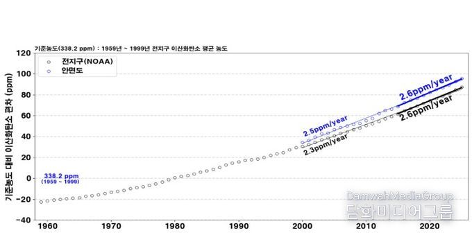 보고서에 따르면 우리나라의 2025년 이산화탄소 배경농도(432.7 ppm, 2024년 429.5 ppm)는 전지구 평균(425.6 ppm, 2024년 422.8 ppm)보다 7.1 ppm 높은 수준을 기록했다. 전년 대비 3.2 ppm 상승해 최근 10년(2015~2024) 기간 중 두 번째로 큰 연간 증가폭을 보였다. 또한, 우리나라에서 가장 오랜 기간(1999년~) 관측해 온 안면도 이산화탄소 관측 결과를 근거로 우리나라 이산화탄소 배경농도는 2000년 이후 연 2.5 ppm씩 높아지고 있고, 최근 10년에는 연 2.6 ppm의 속도로 증가하고 있다고 밝혔다. 아울러, 전지구 평균 증가 속도는 2000년 이후 연 2.3 ppm, 최근 10년 연 2.6 ppm이다.