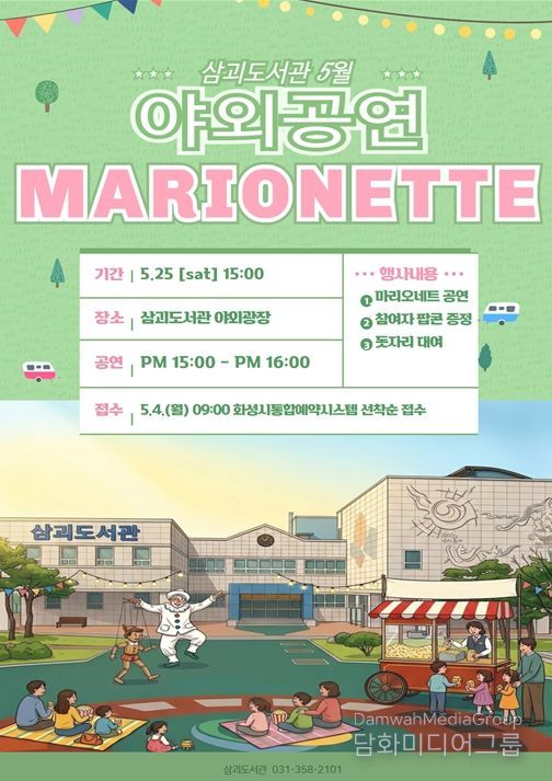 시민행정신문 기자 | 화성시립 삼괴도서관은 5월 가정의 달을 맞아 오는 5월 23일, 도서관 야외광장에서 가족 단위 이용자를 위한 특별한 문화행사를 운영한다. 따뜻한 봄날의 야외 공간에서 누구나 편안하게 즐길 수 있도록 마련된 이번 행사는 도서관을 찾는 시민들에게 색다른 문화 경험과 여유로운 시간을 제공할 예정이다.