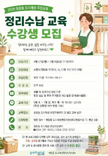 시민행정신문 강갑수 기자 | 포항시 도시재생과는 청림동의 주거 환경을 개선하고 주민 스스로 마을을 돌볼 수 있는 자생력을 키우기 위해 ‘2026 청림동 도시재생 주민교육 : 정리수납 교육 및 집수리 교육’ 참여 주민을 모집한다.