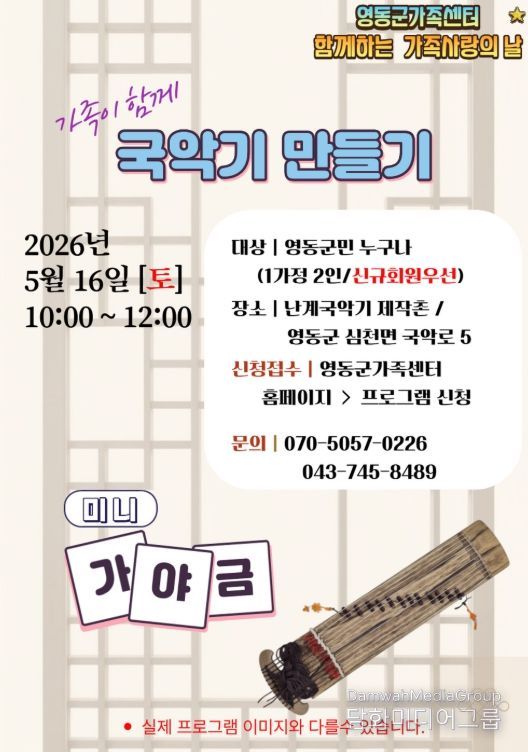 이번 프로그램은 오는 5월 16일 오전 10시부터 12시까지 심천면에 위치한 난계국악기제작촌에서 진행되며, 영동군민 10가정을 대상으로 운영된다.