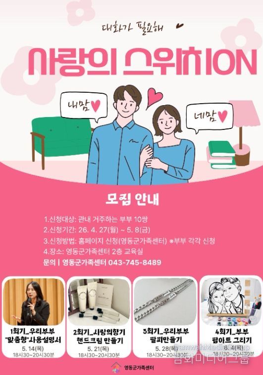 시민행정신문 강갑수 기자 | 충북 영동군가족센터는 부부간 소통과 관계 증진을 돕기 위한 프로그램 ‘사랑의 스위치 ON’ 참여자를 모집한다고 밝혔다.