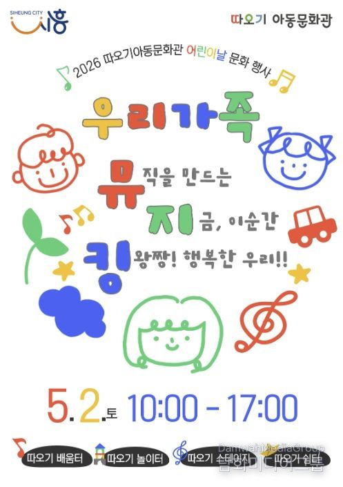 시민행정신문 기자 | 시흥시 따오기아동문화관은 어린이날을 맞아 오는 5월 2일 오전 10시부터 오후 5시까지 따오기아동문화관 야외 일대에서 2026년 어린이날 문화행사 ‘우리가족 뮤지킹’을 개최한다.