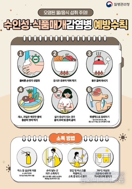 수인성ㆍ식품매개감염병은 병원성 세균, 바이러스, 원충에 오염된 물이나 식품을 섭취해 구토, 설사, 복통 등의 장관 증상을 유발한다. 이를 예방하기 위해서는 ▲올바른 손 씻기 생활화 ▲음식 충분히 익혀 먹기 ▲물 끓여 마시기 ▲채소ㆍ과일 깨끗한 물에 충분히 씻어 먹기 ▲설사 증상 시 음식 조리 및 준비 금지 ▲위생적으로 조리하기 등 예방수칙을 준수해야 한다.