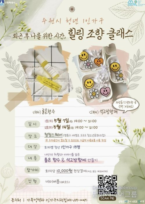 영통구에서는 청년 1인가구 비율이 높은 지역 특성을 반영해 정서 지원 중심 프로그램 ‘힐링 조향 클래스’를 운영한다. 5월 7일과 14일 청청스퀘어에서 열리며, 회차별 15명씩 총 30명이 참여할 수 있다.