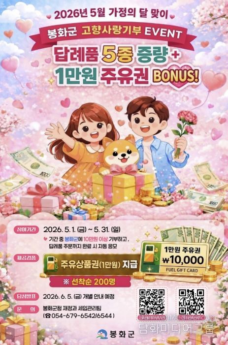 시민행정신문 강갑수 기자 | 봉화군은 5월 가정의 달을 맞이하여 고향사랑기부제 활성화를 위해 5월 1일부터 31일까지 1개월간 “답례품 UP ! 주유권 BONUS !”란 주제로 고향사랑기부제 경품 이벤트를 진행한다.