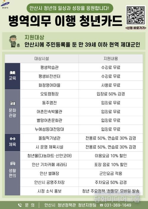 지원 대상은 안산시에 주민등록을 둔 39세 이하 제대군인이다. 신청은 안산시 통합예약시스템에서 할 수 있으며, 경기도 행정서비스 앱 ‘경기똑D’를 통해 모바일 카드로도 발급받을 수 있다.