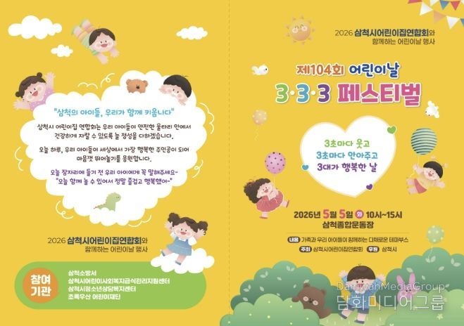 먼저 어린이날인 5월 5일 삼척시어린이집연합회 주관으로 삼척 종합운동장에서 “3초마다 웃고 3초마다 안아주고 3대가 행복한 날”이라는 주제로 ‘제104회 어린이날 3ㆍ3ㆍ3 페스티벌’을 개최한다.
