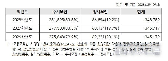 시민행정신문 김학영 기자 | 한국대학교육협의회(회장 이기정 한양대학교 총장)는 '고등교육법' 제34조의5제4항에 근거하여 194개의 전국 회원대학이 제출한 '2028학년도 대학입학전형시행계획'을 취합하여 공표했다.
