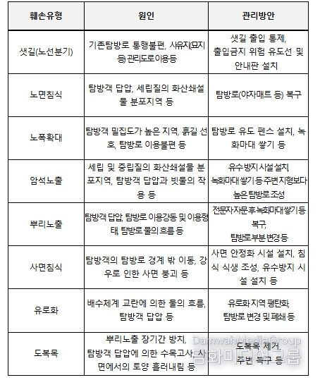 먼저 오름 탐방로 등에서 발생하는 훼손을 노선분기(샛길), 노면침식, 노폭확대 등 8가지 유형으로 구분하고 유형별 관리방안을 제시했다.