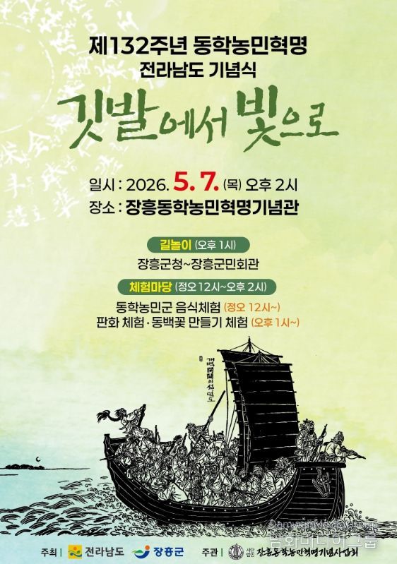 시민행정신문 강갑수 기자 | 전라남도와 장흥군이 공동 주최하고 (사)장흥동학농민혁명기념사업회가 주관하는 ‘제132주년 동학농민혁명 전라남도 기념식’이 5월 7일 장흥에서 열린다.