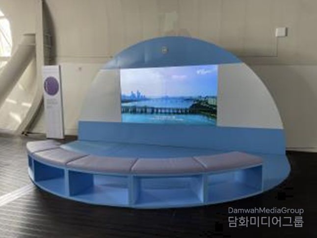 한강의 물줄기를 형상화한 곡선형 테이블 패널을 따라가면서 한강의 유래, 다리 등 다양한 정보를 배울 수 있다.