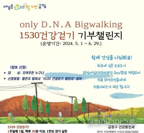 참여 방법은 워크온앱에서 금정구 걷기 커뮤니티에 가입 후, 챌린지 탭에서‘1530건강걷기 기부 챌린지’ 참여하기를 누르면 된다. 자세한 사항은 건강증진과로 문의하면 된다.