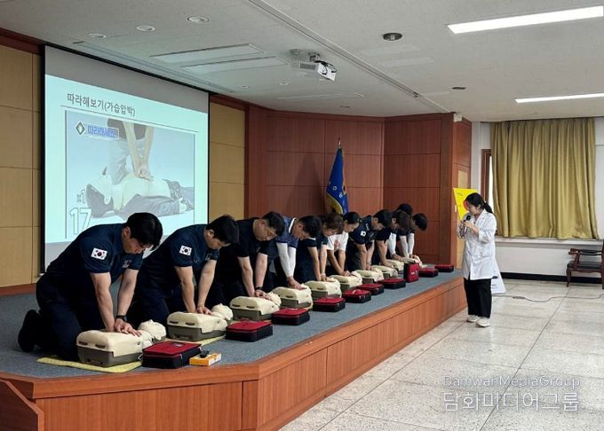 이날 교육은 응급상황에서 ▲의식확인 요령 ▲119 신고요령 ▲올바른 심폐소생술 자세와 방법 ▲심폐소생술 실습 ▲자동심장충격기(AED) 사용방법 등 실습 위주로 진행, 경찰공무원들의 현장 대응 시 응급상황 대처 능력 향상에 주안점을 뒀다.