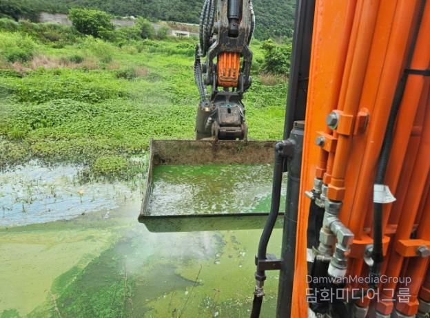 이튿날인 8/1일에는 하천 상류에 햇볕을 차단하는 차광막을 쳐서 녹조의 발생과 저수지 유입을 저지하고, 굴삭기를 투입해 하천과 저수지에 떠 있는 녹조를 퍼냈다.