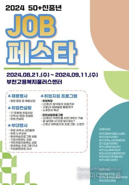 시민행정신문 강갑수 기자 | 부천시는 부천고용복지플러스센터와 함께 오는 8월 21일부터 9월 11일까지 한 달간 50세 이상 신중년 구직자를 대상으로 집중 취업 주간을 운영해 신중년 구직자들의 취업지원 강화를 위한 전방향적인 지원에 나선다.