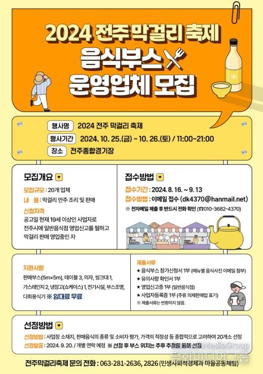 전주시는 오는 10월 25일부터 26일까지 이틀간 전주종합경기장 일원에서 개최되는 ‘2024 전주막걸리 축제’에서 음식부스를 운영할 참여업체를 16일부터 한 달 동안 공개 모집한다.