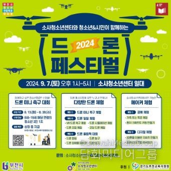시민행정신문 기자 | 부천여성청소년재단이 운영하는 소사청소년센터는 오는 9월 7일 소사청소년센터 일대에서 드론 미니 축구 대회, 드론 체험, 메이커 체험 등을 체험할 수 있는 ‘드론 페스티벌’을 개최한다.