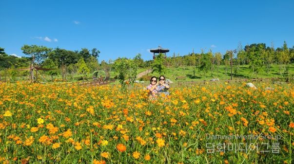 지난 7월 정식 한 노란색, 주황색의 황화코스모스는 황금빛 물결을 이루며 방문객들에게 가을이 다가오고 있음을 알리고 있다.